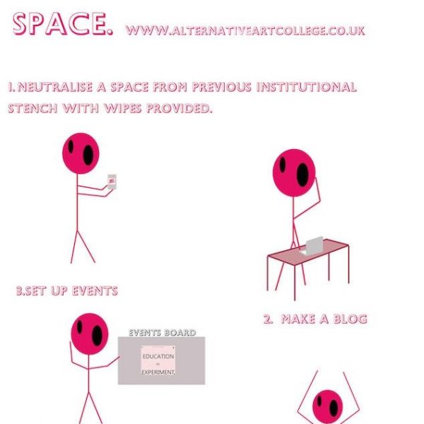 PS: The Alternative Art College is a non-profit education facility, an online creative platform to critique higher education which I developed whilst studying for my Undergraduate (BA Fine Art). In 2010 the government begin to dismantle the higher education system, home students’ tuition fee increased to £9000 per year. The response to this was in the form of mass demonstration; this often was unsatisfactory because of the reaction of the authorities. In response to these events I set up the Alternative Art College in the tradition of protest art, as a proactive form of protest that was an alternative both to the prospect of an increasingly expensive education system and also to the existing forms of protest that were being used in 2010.