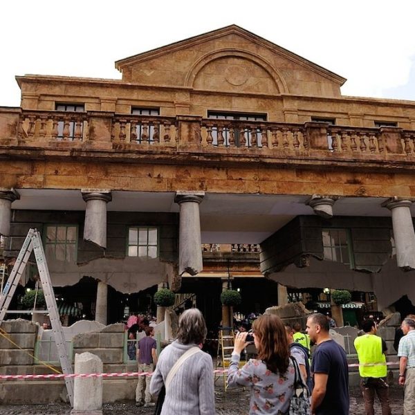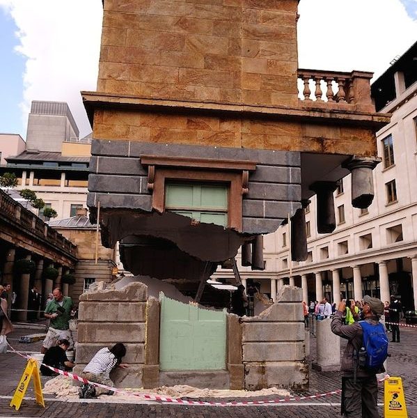 其實這個和考文特古色古香的老建築環境融為一體的“懸浮”門廊是英國藝術家亞曆克斯·欽尼克的一件新的藝術作品。欽尼克善於運用戲劇性的視覺場景來構建他的作品,他曾經創作過牆面花落的房子,也曾經將整個建築的外立面整個顛倒過來,總之,他一直在運用出人意料的思維邏輯來進行創作,而作品往往難以用文字加以闡述,但當你真正面對他作品的那一刻,就會立刻明白他作品中充滿的黑色幽默和不同尋常的巧妙想法。這一次也不例外,“懸浮”著的門廊從大小比例到外觀細節上都與考文特市場的門廊沒有任何分別,唯一的區別就是這座門廊的上下兩個部份好像是被閃電從中間貫穿劈開一般,在沒有任何支撐物的情況下,上半截門廊就那樣懸浮於空中,不禁讓人覺得是有什麼魔法的力量在支撐著它。穿梭于市集的人們都被這個作品吸引了,好奇地圍著作品仔細研究,看看到底這個作品到底是怎麼“漂浮”起來的。