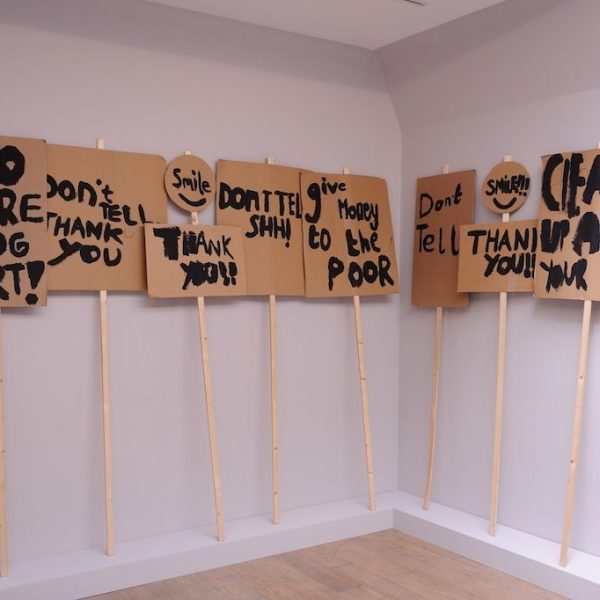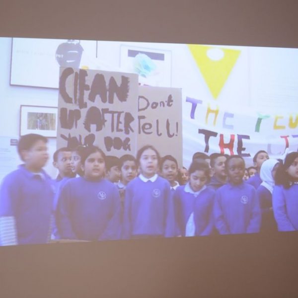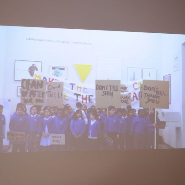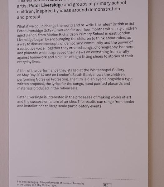 Inspired by ideas around demonstration and protest, British artist Peter Liversidge (b.1973) worked with sixty children on a performance staged at the Whitechapel Gallery, on May Day 2014. Together they created songs, choreography, banners and placards which expressed their views on everything from ‘No More Homework’ and ‘Our shoes are too tight’ to ‘I Don’t Like Cooked Tomatoes’ and ‘Less trucks and cars. More chocolate bars!’