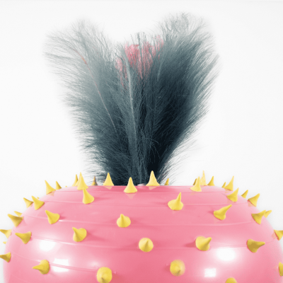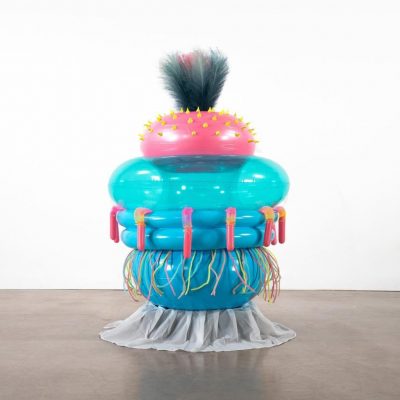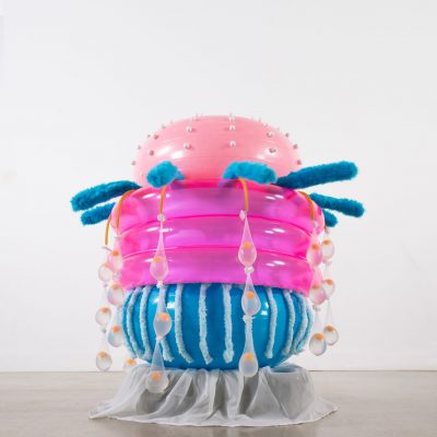 The question of desire also leads into the question of fetishism and whether this pertains to these works. It is partly the relationship of conjunctions that are being entertained, as in Meret Oppenheim’s ‘Luncheon in Fur’ (1936) or more recently Zhu Tian’s ‘Babe’ (2013). In these two works, it is not just the conjunction of the inorganic and the organic generates displacement, but also how the material in question perform or release affects. Fetishism also invariably joins to abjection which performs as a quality between the object and the subject. Plastic has its roots in the names of Greek shepherds such as polystyrene and was initially viewed as a wonder material but now is seen as (trashy) base matter capable of being moulded, receiving shape, or undergoing deformation. As possibly one of the most toxic pollutants, it is a material born out of industrial transformation of nature that in turn transforms its relationship to nature as a pollutant of it, and as such, it is invariably viewed as being in excess. In its foundation within Modernity, it signified an optimistic, popish mode of the forever new, whereas within the turn towards a late or exhausted Modernity its connotations are imbued with the rhetoric of accumulated dysfunction. Returning though to a broader signifying chain of qualities pertaining to fetishism, abjection, animation, fantasy, excess, absurdity, and performance that can be detected in the work of this exhibition, they are also part of a sign economy of evasion or complication that render the relationship to the perception of the work complex. The trashy, saturated, playful surfaces are not just entertained in a knowing or critical fashion, but also pose questions that are evident within more abstracted figures that might cohere within and below such surfaces. Something is moved and within what moves, an allure is created. Yet there is also something else in the form of that which withdraws or resides in an elsewhere of what stands in open visibility. An example of this is in the work ‘Fragile’ that points towards a much darker form of repetition-compulsion that underlies the futility or the cracking up of the logic of a machinic assembly that is simply compelled to go round and around in the forever of empty circulation.