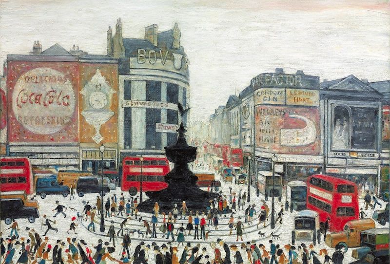 Exhibition highlights include Ancoats Hospital Outpatients Hall 1952, painted in the early years of the NHS, shown beside an earlier street scene, The Cripples 1949, which shows those disabled by war and illness. Images of London, to which Lowry was a regular visitor, include Piccadilly Circus, London 1960.