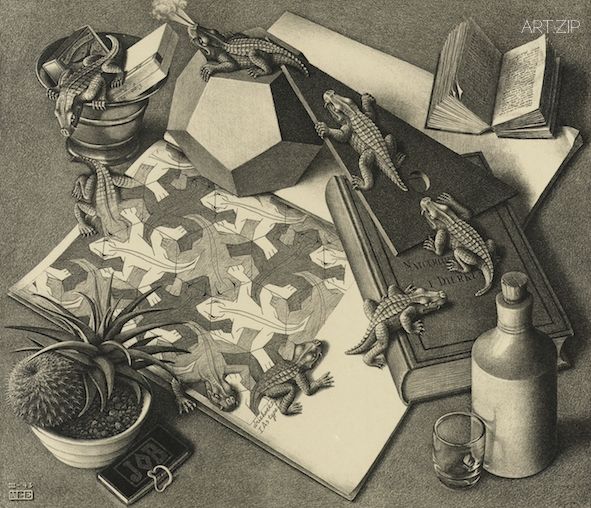 Escher’s world is one of playful imagination and the unexpected, executed with mathematic precision to create impossible, timeless realities that would inspire amazement in the viewer. He often communicated with – and absorbed much from – academics, most notably the British-born mathematicians H.S.M. Coxeter (1907-2003) and Sir Roger Penrose (b. 1931).