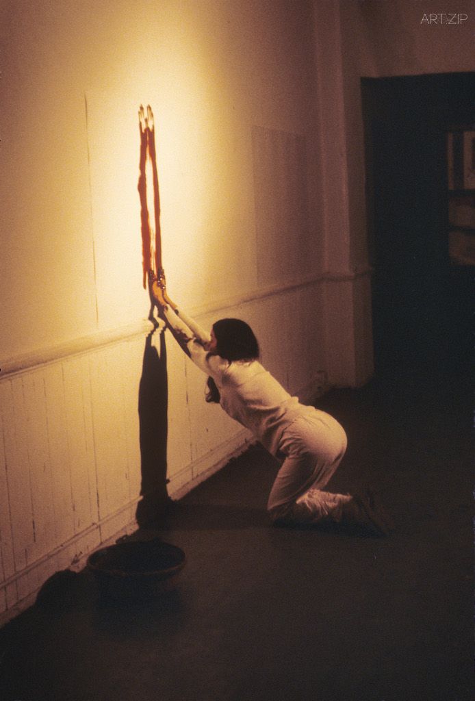 在古巴出生,而在美国长大的艺术家Ana Mendieta 的很多作品有着清晰简洁的语言,以及直接的呈现方式。在名为Body Track的作品里, Mendieta用沾满血渍的双手,在墙面上一气呵成的勾画出女体的轮廓。这也成为了Mendieta相当经典的一幅作品。在Body Track的系列里既有影像记录,也有不同规格形状的‘血渍绘画’。视频的记录多不过一分钟,一个动作,清晰明了。而被画框框住的‘绘画’,因血液和蛋彩的结合,而保存下了醒目的颜色。血液的运用也与Mendieta作品中另外的一个题材有关联,那就是唤起大众对 针对女性的暴力事件的关注。 在几幅名为‘Re-enact Rape’的表演作品中。Mendieta复制了女性因强奸事件而丧命的现场, 她把自己裹在沾有血渍的布料里。