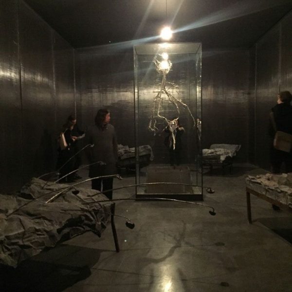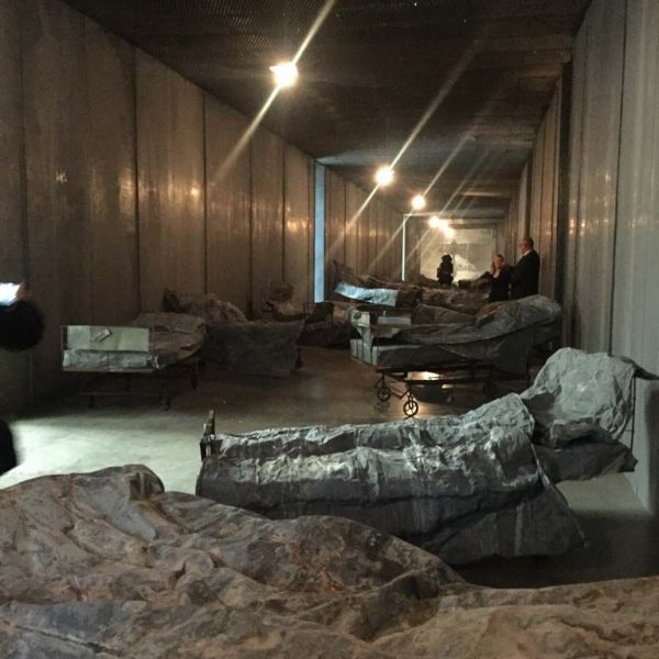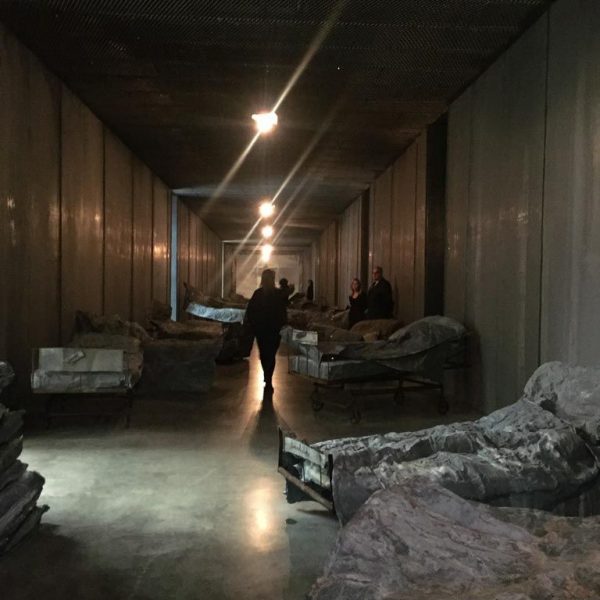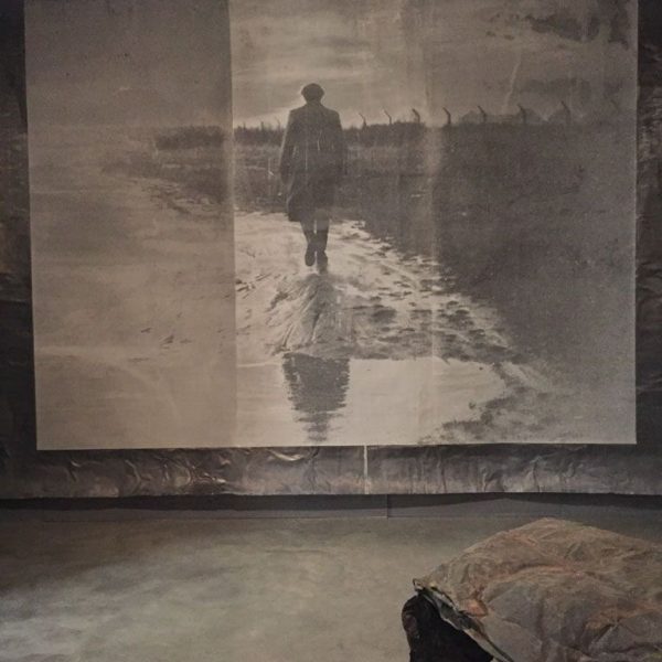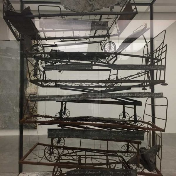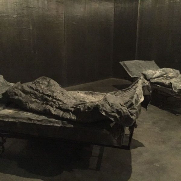 The exhibition focuses on the major new installation Walhalla in the central corridor space, from which the other works thematically depart. Featuring a long, narrow room lined with oxidised lead, rows of fold-up steel beds are set close together and draped with dark grey crumpled lead sheets and covers. At the far end of the room, a black and white photograph mounted on lead depicts a lone figure walking away into a bleak, wintery landscape. The whole is dark, sombre and sparsely lit by a series of bare light bulbs, suggesting an institutional dormitory, military sleeping quarters or battlefield hospital. This sense of morbid claustrophobia is countered nonetheless by the offer of rest, of a break in the journey; a place perhaps of transformation.