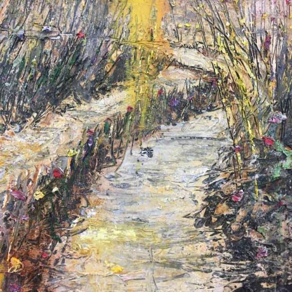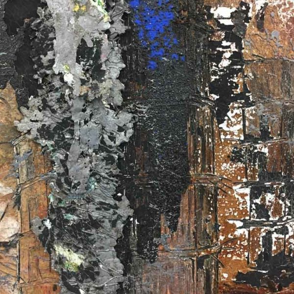 In his new paintings, Kiefer employs a range of media – oil, acrylic, emulsion, shellac and clay – to emphasise the space of painting as a threshold into a mythic, imaginative realm. Here, a series of high towers are set amid desolate landscapes, their stacked forms exploding and dissolving into clouds of deep black or caustic blue smoke. A familiar motif in the artist’s work, the towers are based on his own sculptures made from rough concrete casts of shipping containers, including the brutalist-style towers of Jericho made for the set of In the Beginning staged at Opéra Bastille in Paris in 2009. In one such painting, Kiefer depicts the towers up-close, as if the viewer has found themselves in the ruins of some ancient city. In another work, which consists of three panels, flights of steps leading up to each tower reference the neo-classical, imposing architecture of Walhalla. Here, however, rather than the symbolic bastion of power that Walhalla aims to evoke, they are flat and two-dimensional, overlaid and set at impossible angles under the expanse of a meridian blue sky. In other pictures, which echo the landscapes of Van Gogh, the paintings are divided by a rough track, receding as far as the eye can see and often encrusted with layers of paint and deposited with a bitumen-like matter.