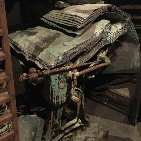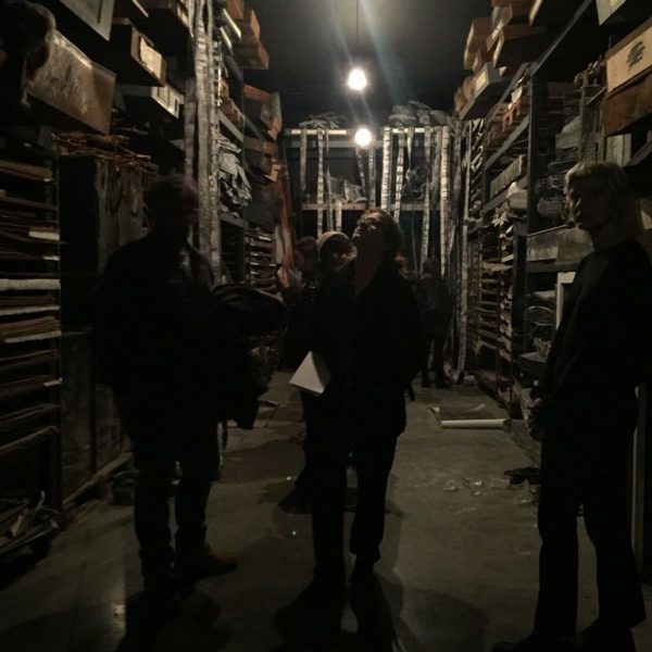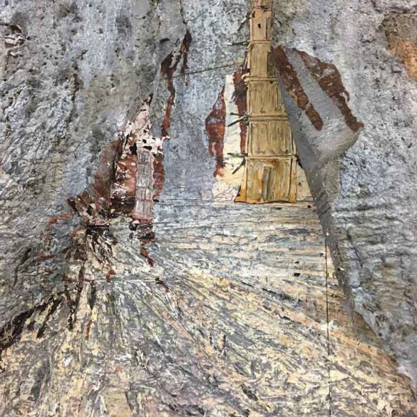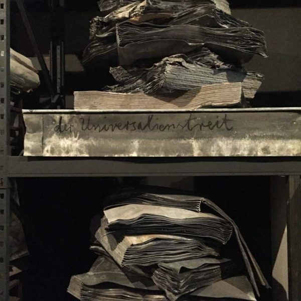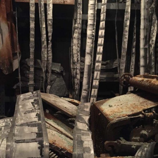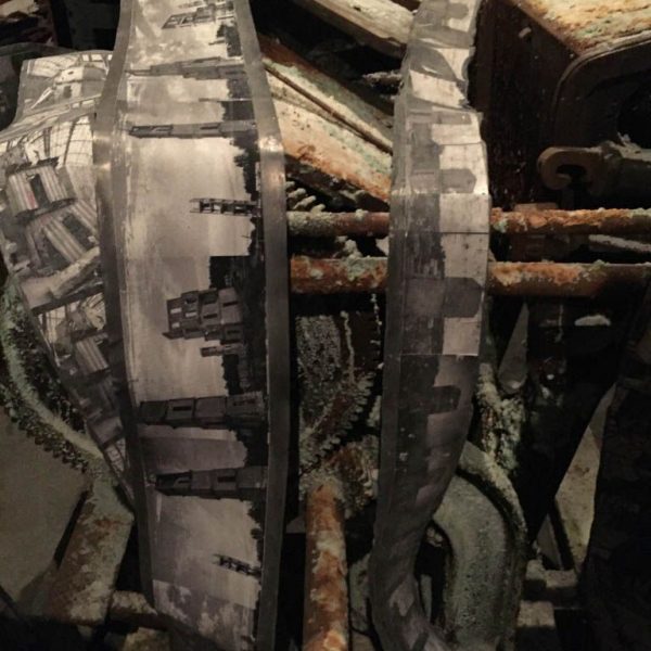 In the ‘9 x 9 x 9’ gallery, a dramatic, rusted metal spiral staircase disappears into the ceiling. Along its handrails hang curling strips of film reel, mounted onto lead, and soiled, robe-like dresses on wire coat hangers. In Norse mythology, Valhalla is linked to the Valkyries; women who decided who would live and who would die in battle. After making this choice, the Valkyries accompanied the dead to Valhalla, the hall of the slain in the afterlife ruled over by the god Odin. Entitled Steigend steigend sinke nieder (2016), this sculpture relates to the moment when the Valkyries arrive at Valhalla, their robes periodically discarded along the climb, suggesting loss and the trace of bodies that are no longer there.