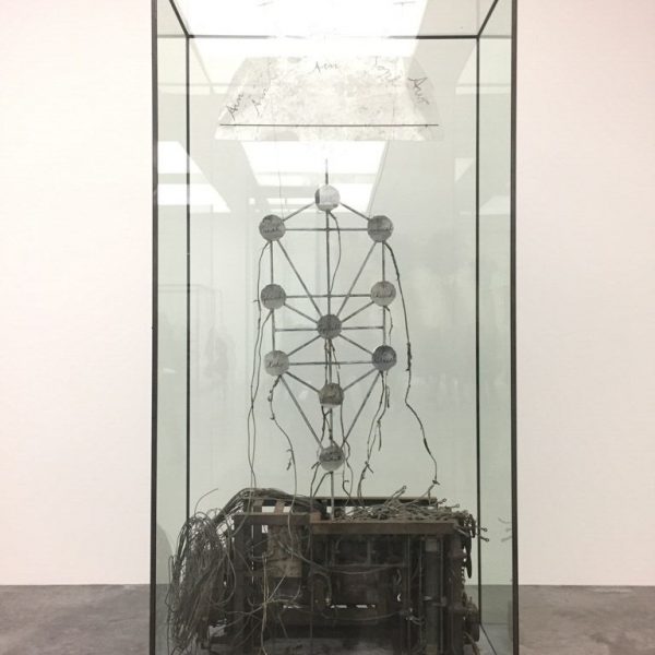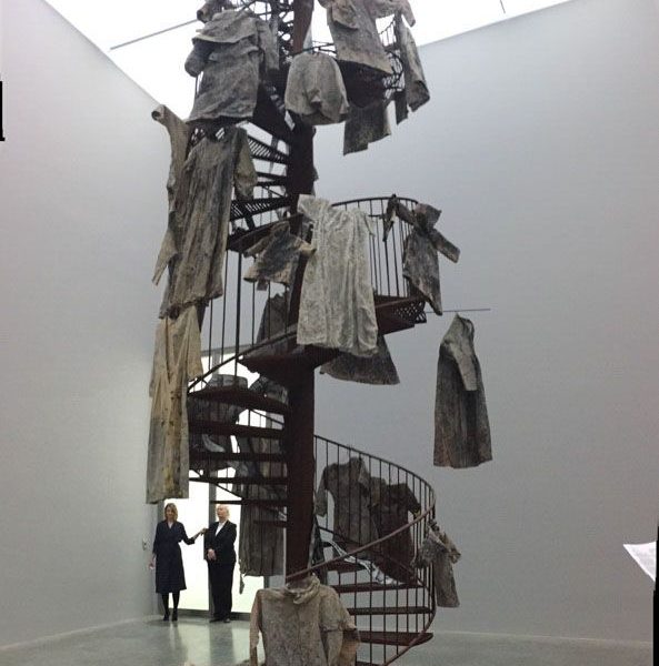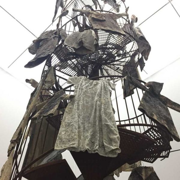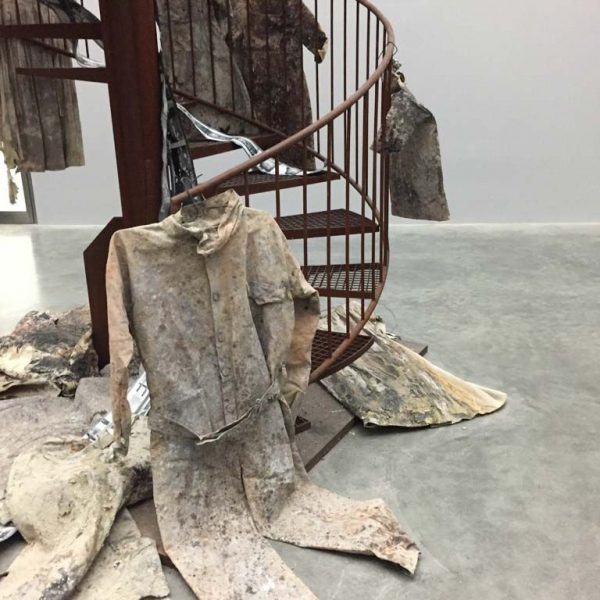 在畫廊的“9x9x9”空間裡,一座生鏽的螺旋樓梯一直延伸到天花板,格外引人注目。沿著它的扶手懸掛著許多繃在鉛板上的膠片和臟兮兮的長袍式衣裙。在北歐神話裡,瓦爾哈拉/英靈神殿(Valhalla)與女武神瓦爾基麗(Valkyries)密不可分,女武神們決定著戰爭裡的戰士誰生誰死。在她們做好決定之後,女武神便陪伴著這些這些死者走入瓦爾哈拉,也就是由神明奧丁(Odin)掌管的英靈神殿。雕塑《Entitled Steigend steigend sinke nieder(2016)》,描繪的就是女武神到達英靈神殿的那一刻,她們的長袍沿著旋轉樓梯依次懸掛,暗指生命消逝,軀體亦逐漸消亡。