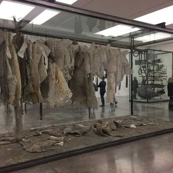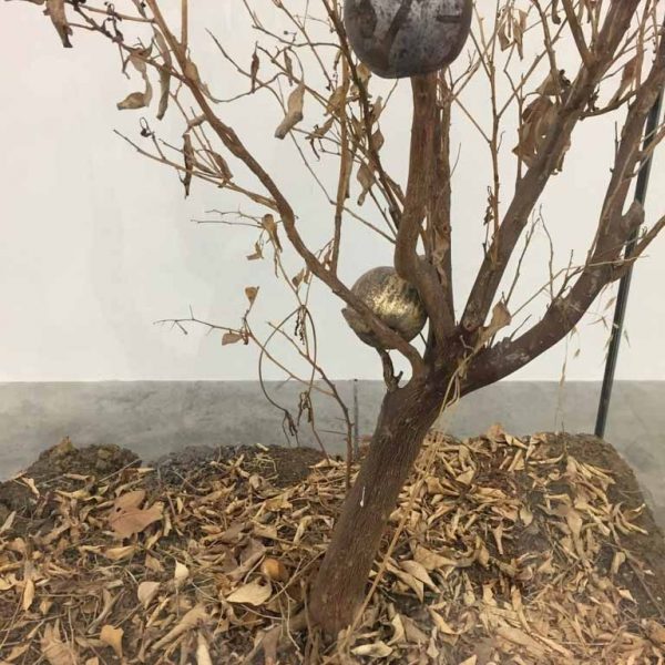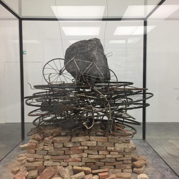 此外,大小不一的玻璃櫥櫃裡展現的雕塑延續了這些主題,通過組合褪色的衣物,石頭,層層疊疊的金屬床,單車,又或者從土裡分割出來的小樹,這些材料被封存在玻璃櫃裡進行展示,就像化石一樣,又或者是出土文物,被埋葬在玻璃鉛櫃裡。