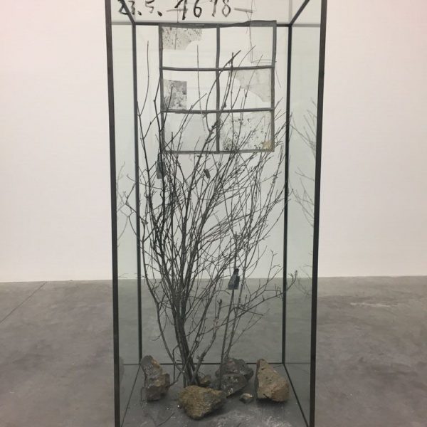 Several new vitrines, in different scales, continue these themes, through assemblages of soiled bleached clothes, stones, stacks of institutional metal beds, bicycles or small trees set upon squared off, cut-out sections of earth. Sealed off and displayed, these objects appear like fossils or unearthed artefacts entombed in glass and lead cases.
