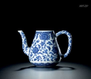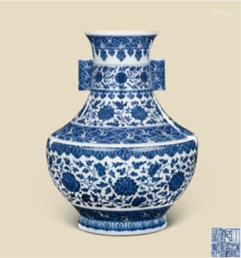 - 清乾隆青花缠枝莲纹贯耳尊,纹饰繁密富丽,发色稳定明快,自口沿到底足绘有海浪、石榴、缠枝莲、如意、缠枝各式花卉等十层纹饰,精益求精。