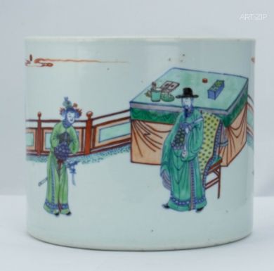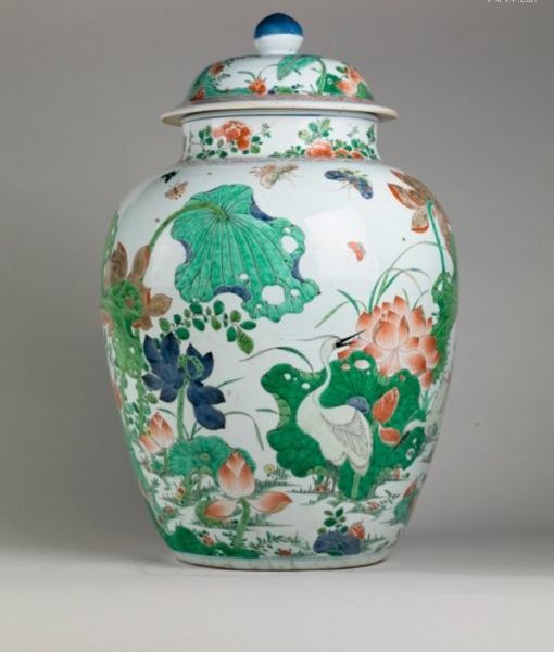 - 由著名古董商埃斯肯纳齐(Eskenazi)旧藏的清康熙五彩加金莲鹭纹将军罐,是康熙五彩瓷器中的精品,其鲜明特征是在五彩中添入了过去没有的金彩和釉上蓝彩。通体以白釉为地,上以红、绿、蓝、金等色彩绘鹭鸶莲塘纹,莲叶随风摇曳,莲花或含苞或怒放,莲间点缀着彩蝶、鹭鸶。整个画面以写实手法细致入微地刻画出一幅自然恬静的夏日荷塘美景。 此罐器型秀美,色彩丰富,尤其是金彩的应用,使之愈显富丽堂皇。
