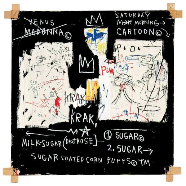 Basquiat first came to the media’s attention in 1978, when he teamed up with his classmate Al Diaz to graffiti enigmatic statements across the city under the collective pseudonym SAMO© (a contraction of ‘same old, same old shit’). He collaborated with other artists, most famously with Andy Warhol, created murals and installations for notorious New York nightclubs including the Mudd Club, Area and Palladium, and in 1983 produced ‘Beat Bop’, a classic hip hop record with K-Rob and Rammellzee.