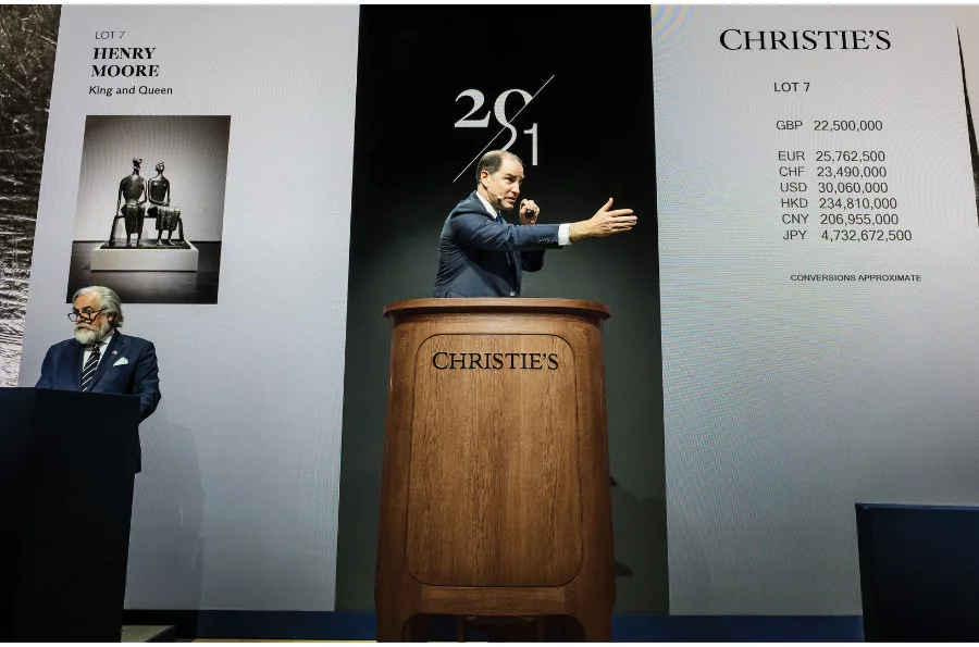 Adrien Meyer, Global Head of Private Sales & Co-Chairman, Impressionist & Modern Art, selling Henry Moore’s King and Queen in the new Christie’s rostrum, redesigned by Sir Jony Ive and his team at LoveFrom