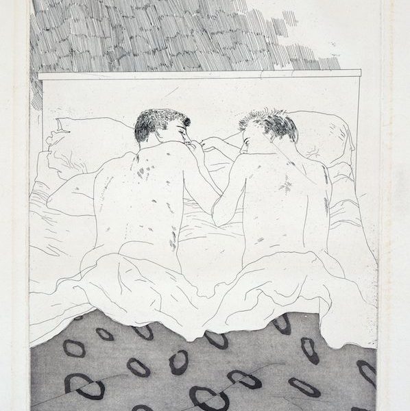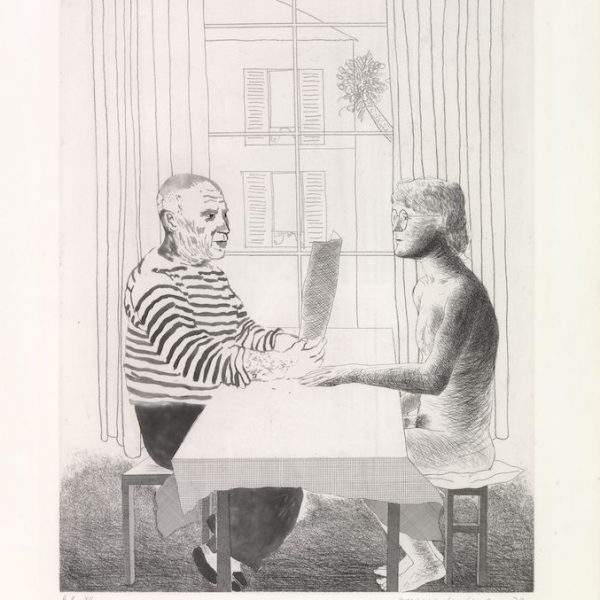 Hockney’s dislike of repetition and routine explains the enormous diversity of his output as a printmaker. However, throughout his career he remained faithful to the two main printmaking techniques of etching and lithography. In retrospect we can see that the 60s and 90s were dominated by his work in etching, whilst the 70s and 80s were largely given over to lithography. Working closely with master printers such as Maurice Payne, Aldo Crommelynck and Kenneth Tyler he learned an enormous amount about the craft of printmaking. These skills he put to use constantly striving for new effects and new modes of expression.