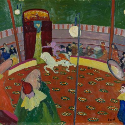 Tate Modern’s exhibition begins with the collective’s core couple of Kandinsky and Münter and their creative network in pre-First World War Munich. Munich at that time was an artistic hub of experimentation where different cultures and experiences converged. A room of stunning portraits and self-portraits introduce this diasporic creative community, including Marianne Werefkin’s Self-Portrait c. 1910 and Münter’s Listening (Portrait of Jawlensky) 1909. A selection of photographs from the Masterpieces of Muhammadan Art exhibition staged in Munich in 1910 and Erma Bossi’s bold and expressive Circus 1909 demonstrate diverse urban experiences, while themes of sexuality and performance are explored through Werefkin’s collaboration with free-style performer Alexander Sacharoff, including her provocative 1909 portrait reflecting the dancer’s androgynous persona.