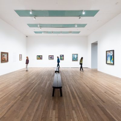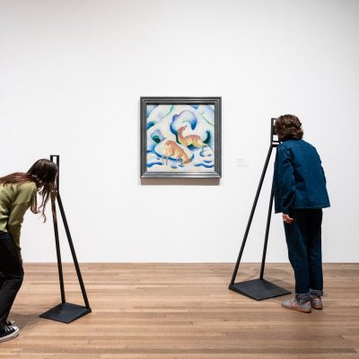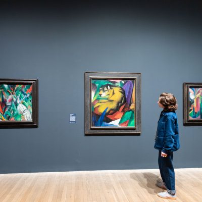 Some rooms offer visitors experiential environments focused on single works which capture modernism’s fascination with sound, colour and light. These include Kandinsky’s Impression III (Concert) 1911, revealing his interest in the neurodiverse condition known as synaesthesia in which one of the senses is experienced through another, and Franz Marc’s 1911 Deer in the Snow II, whose mysteries are unlocked through an exploration of colour theory and optics.