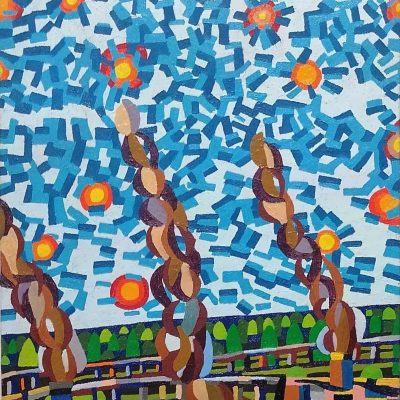 Similarly, Xie Shan’s paintings begin with direct visual observation, depicting a world that evokes deep emotions. The vibrant colours and dynamic images bring life to otherwise static scenes. His unique arrangement of specific elements—circles, arcs, and stripes- sets Xie Shan’s work apart. These images, which exist between abstraction and representation, are transformed by Xie Shan’s personalised arrangement into profound symbols of significance. The open-ended interpretation of these images is not confined to a simple ‘image-to-narrative’ correspondence but rather diversely engages the senses through a unique artistic method. This visual intuition precedes conceptualisation, and the painting language is shaped by the artist’s cultivated qualities, which is where the true charm of Xie Shan’s art lies.