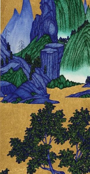 最後一位是1969年生於臺灣的藝術家姚瑞中。邁克爾•高德尤斯畫廊最近展出了這位藝術家 的“小山水(Small Landscape)”系列,這是他最新的水墨作品。這次創作他並沒有用畫筆作畫,在傳統畫藝的基礎上,摒棄了水墨畫的常規藝法,自如地採用色彩和金箔進行創新突破。姚瑞中在藝術領域扮演着十分有趣的角色,他既是策展人,也是藝術評論家和藝術史學家,在臺灣和全世界評鑑和推廣臺灣當代藝術。從國立臺灣藝術大學畢業後,姚瑞中任教於該大學。他的作品常帶着絲絲幽默感,譬如“甜蜜蜜:賞蝶圖(Honeymoon:Butterfly Diagram)”頭上長角的但文人穿著的人物。高德尤斯說:“姚瑞中擁有獨特的藝術造詣,運用原創的技法和題材,論述中國藝術現今與過去 的融合,為現代藝術增添了簡約的雅致。”