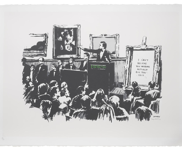 本次拍賣有大量街頭藝術家班克斯(Banksy)的限量版絲織印刷作品。班克斯的粉絲們有望在拍賣中拍得屬於自己的大師簽名藏品。如2003年作品“扔花的人”(Flower Thrower)估價8千英鎊—1萬2千英鎊。紅色的背景下是一個看似恐怖主義或英國憤青的小夥,用投出炸彈的姿勢準備扔出一束代表著愛的花。2007年作品“傻x(白色)”Morons, (White) 估價4千—6千英鎊。本作品生動的描繪了拍賣場上全神貫註的各界人士,拍賣員似乎在人們畫面裏看不到的地方與某人交流著,拍賣數值不清晰但似乎已經顯示是天價了。作品是一個古典畫框裏的一段話 — “我可真想不到你們這群傻x 會買這種東西”。