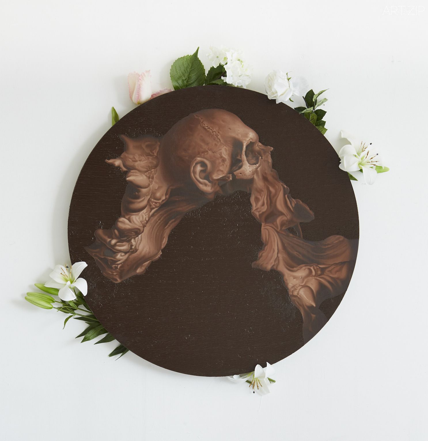 A spray of shaving foam transforms the shape of a skull. In another painting it forms a ‘sculpture’ but then subsequently collapses beneath the weight of a brick. Like wax, shaving foam is a fluid and mutable substance. It can be sculpted into suggestive shapes, but with time it will lose its form and collapse, becoming nothing but a pool of soapy liquid. It can appear solid but its inevitable collapse is inherent, like the party balloon. As such it is another vanitas symbol, albeit a very contemporary one.