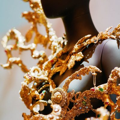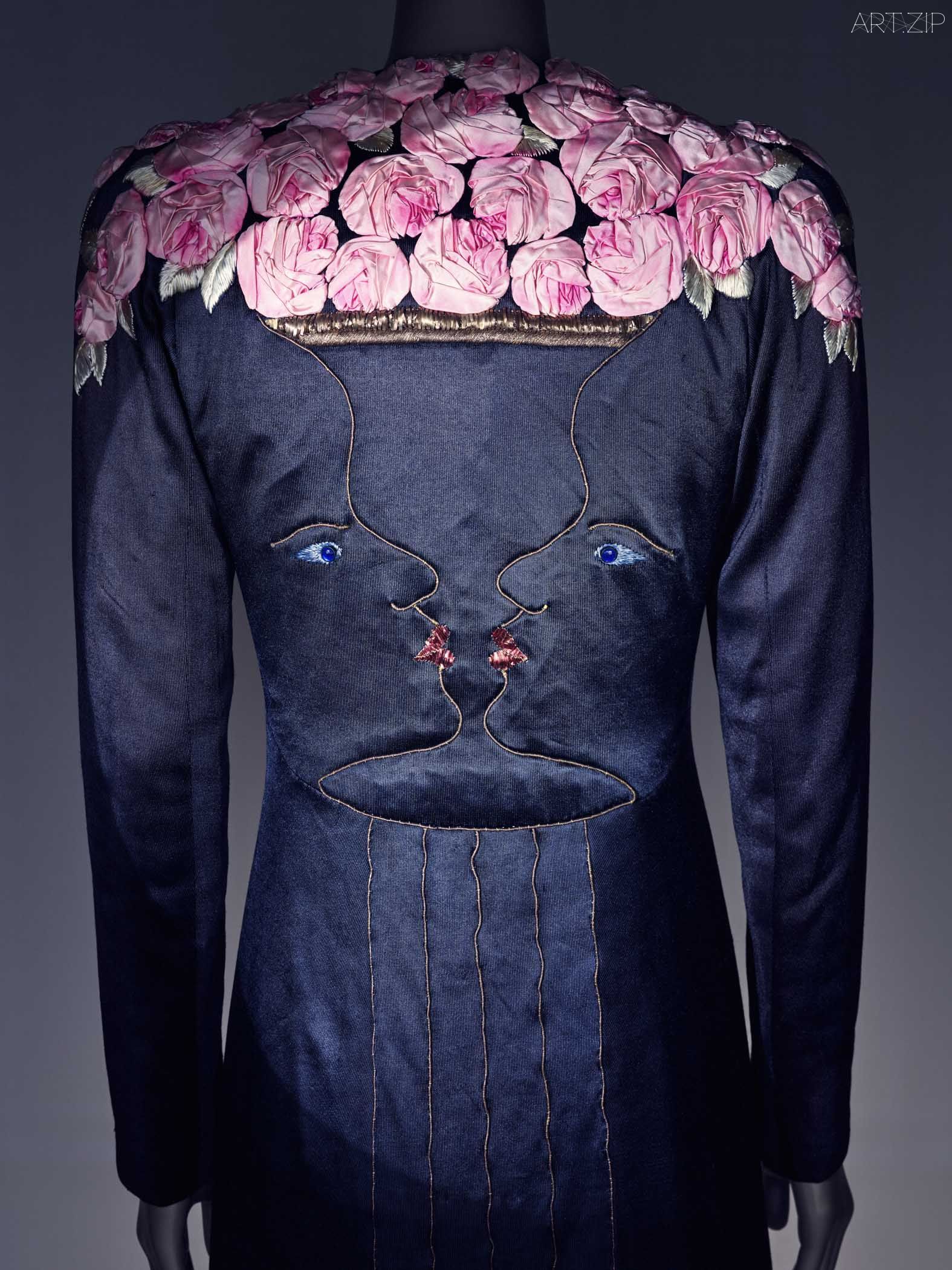 The second, a black corridor, slows the body almost instinctively, stilling the mind and drawing the eye toward fourteen richly detailed jackets displayed with care. Thirteen coats arc outward in a subtle choreography around a commanding centrepiece designed by Daniel Roseberry— a substantial jacket that preserves Schiaparelli’s characteristic exaggerated silhouette while incorporating elements of Surrealism and Cubism. Eyes, lips and noses drift across the breadth of its sleeves, while gilded anatomical forms and swaying fringes lend the garment a genuinely magical presence.