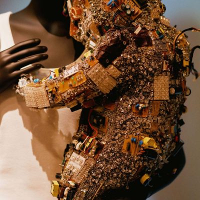 Elsewhere, the Skeleton Dress — so arresting at the entrance — reappears in another space, this time facing away. From the back, one can trace the clear line of its spine, and sense that through the display window before it, the dress is somehow looking back.