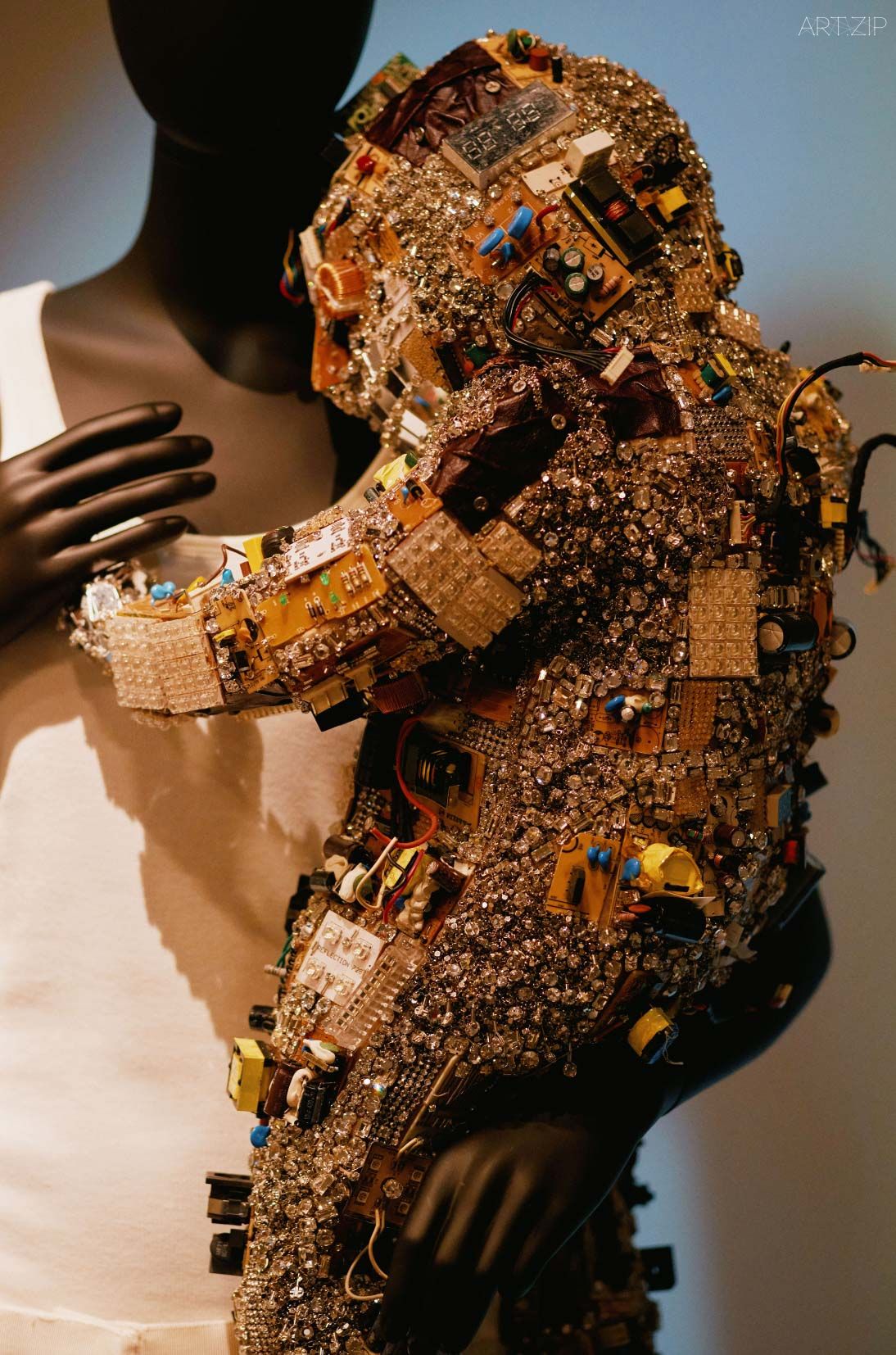 從前一展廳望去,在整齊站立的人形模特之間,一個坐在地面的背影顯得有些不同。待觀眾繼續前行,到達下一個展廳時,才發現它被安置在牆頭之上,彷彿在默默注視著對面的一眾禮服與來往的觀眾。