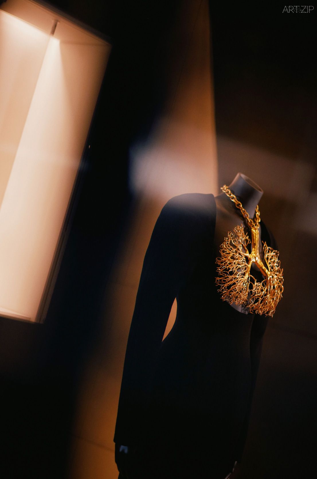 而影像盡頭,是她最著名的作品:肋骨禮服與肺葉項鍊。它們如同守門者般矗立——既是視覺上的震撼開場,也在無聲地宣告:「時裝在這裡不只是衣物,而是一種命題。」Hunt 將這些設計稱為「一個為無意識、非理性與奇妙而設立的劇場(a theatre for the unconscious, the irrational, the marvelous)」。