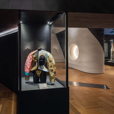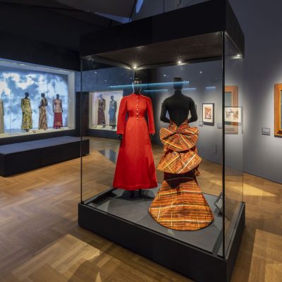 Seen from the preceding room, a seated mannequin positioned on the floor stands out among the rows of upright figures. Moving into the next gallery, one discovers that it has been placed atop a wall — as though silently watching the gowns and visitors arrayed before it.