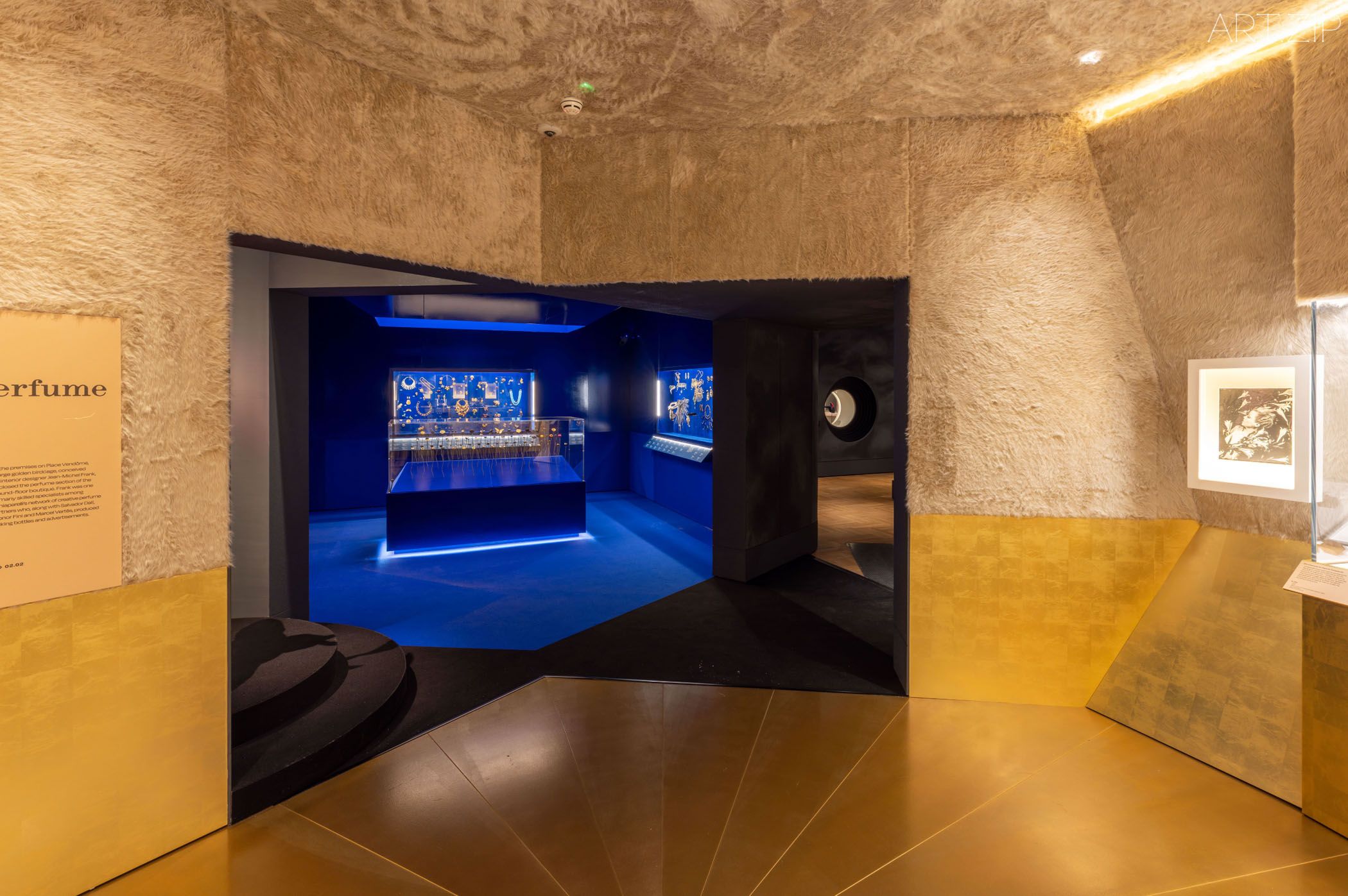 The entrance carries a strong sense of ceremony. At its centre hangs a portrait of Schiaparelli, flanked on either side by walls of ever-changing images. Scenes dissolve slowly, new forms rising to the surface like memories shifting through time. In that moment, it is difficult not to feel a certain illusion take hold — as though one is crossing the threshold into an enchanted world.