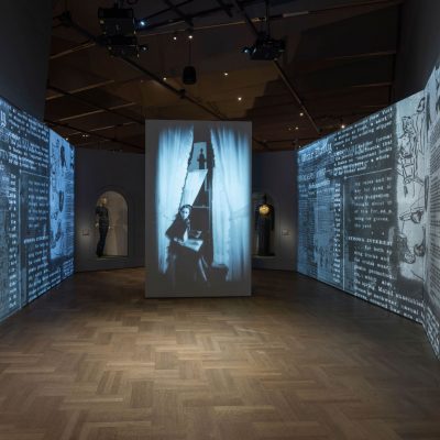 One of the exhibition’s most distinctive features is its use of moving imagery as backdrop.