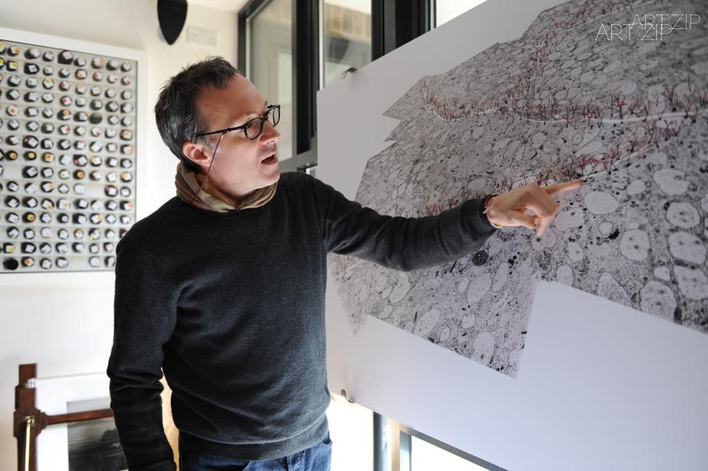 這些年裡,他拍了女王,還有被女王耗下去的四任前首相,還有各種明星,但工作室裡只能看到他自己的藝術作品,一直關注於對“大量”(密集)的關於人類生存主題的作品,我們的生活與環境,越來越多的人口與城市承載力之間的關係,我們到底能不能建造一個能適應不斷湧現大量人潮的適宜居住的城市?宏觀世界的視角與微觀之間的辯證關係?很熱情的一個人,願意與所有人探討他的藝術和我們生活的世界,與各類科學家一起為國王學院創作的作品也非常有意思。