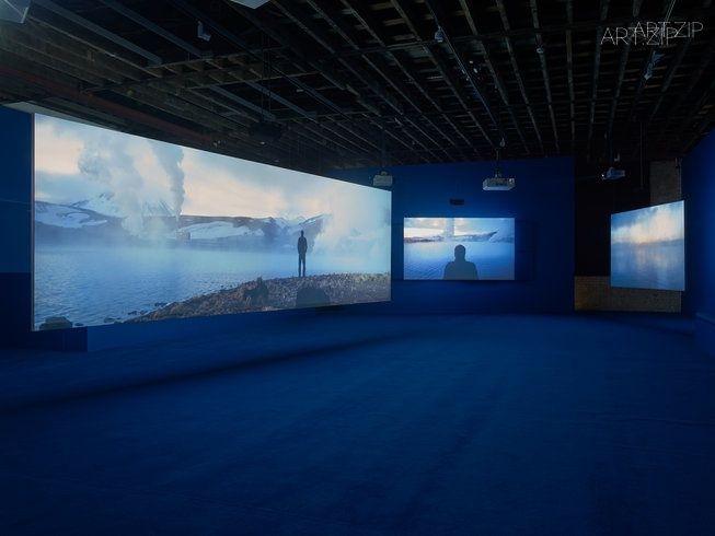這個由七組屏幕構成的影像裝置名為‘PLATIME’, 圍繞著金融資本流動的主題。而‘資本’也是貫穿於朱利安近年來作品的主旨之一,PLAYTIME因此也可以被看作是藝術家對資本流通的一種視覺記錄和表達。多屏幕的空間投影架構也是朱利安這幾年來的創作特征。在入口處,有畫廊助理提醒觀眾們“請隨意走動”。 但 Victoria Miro原本大小尚可的空間,在這樣一個對感官效果要求復雜的裝置下,也顯得小氣了一點。在二樓的空間裏,7個屏幕組成了6夾1的環形構造,其中最長的屏幕懸掛於中央,也自然成為了觀眾們視覺的焦點。而不知是否是由於英國觀眾們的拘謹習慣,現場鮮有‘隨意走動’的,即便有,多半也都只能在繞圈子,其余大多都圍聚在現場的四組‘理想觀測點’的沙發周圍。這樣的一個新作品的展出,想必也是呼應紐約MOMA此時同期上映的朱利安的Ten Thousand Waves,而後者更加具有流動性的9屏空間設計和更為復雜的敘事,或許才達到了朱利安給自己設出的挑戰。