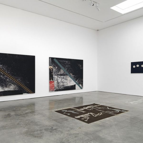 Sergej Jensen’s delicate and poetic work incorporates material as a symbolic interface, in minimal compositions that are sewn rather than painted. Jensen collects fabrics and textiles compulsively, such as antique scraps or bolts of expensive fabric, and commissions his mother to hand-knit pieces to his own specifications combining references to design and fashion with a history of modernist abstraction. A notion of recycling continues in Sterling Ruby’s visceral work, which mixes a punk aesthetic with gestural abstraction, incorporating and re-purposing sections of fabric or denim combined with scratched, defaced, exploded graffiti-type elements. Bleach poured onto the canvas ground creates unpredictable compositions that visibly register an action during their making.