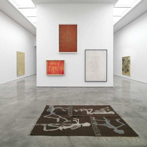 Collaboration and political themes continue in the work of both Danh Vo and Mona Hatoum. Danh Vo’s conceptual work exposes history as it is manifested through material objects, bringing different layers of time together and interweaving personal and political narratives. For this exhibition, he has produced an installation that focuses on the often bloody history of Christian colonialism. Working with weavers in Mexico, Vo’s series of blood red rugs are dyed with cochineal, once highly prized by the Conquistadores and as economically valuable as gold, tracing how colour relates to economy, fashion and ideology. Mona Hatoum’s work 4 Rugs (made in Egypt) (1998/2015), was produced in Cairo with a local carpet school for the Cairo Biennale in 1998. Hatoum asked the school to create carpets featuring the image of an articulated skeleton, which had been dropped onto the floor to fall naturally into different figurative positions. With their brown tone and rectangular form, the rugs suggest soil graves and relate to both the massacre of 62 tourists near Luxor, Egypt in 1997 as well as to skeletons still visible in the rectangular rooms of Ancient Egyptian labourer’s houses which are sited nearby to the Luxor temple.