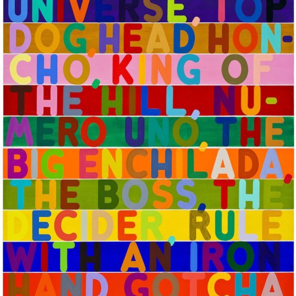 The exhibition also presents his recent ‘Thesaurus’ paintings, colourful word chains including the piece Amazing! (2011), which features a 21st century language: from ‘awesome!’ and ‘groovy!’ to ‘gnarly!’ and ‘omg!’. As the eye reads the text, letters and words advance or recede according to the shade Bochner has painted them. The experience suddenly becomes about colour itself, while their humour reveals a subtle politics.