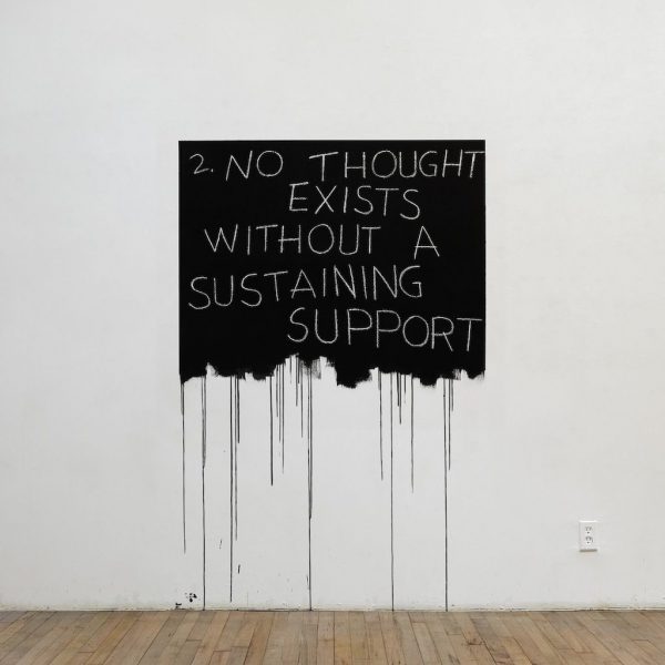 One of Bochner’s ‘Measurement’ pieces lights up the staircase where lines of 48 inches are randomly scattered across the wall, alluding to Marcel Duchamp’s last painting Nude Descending a Staircase. At the top of the stairs one of Bochner’s guiding principles, No Thought Exists Without A Sustaining Support (1970), is chalked directly on the wall, as if on a dripping blackboard.