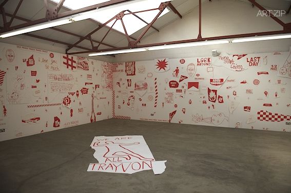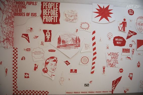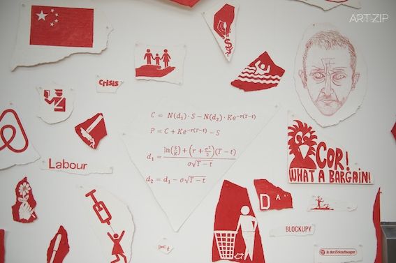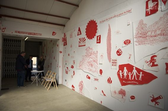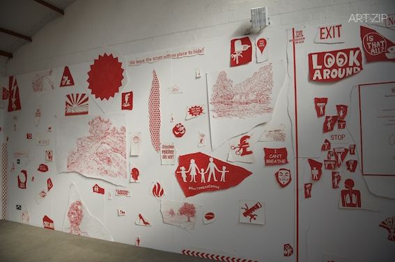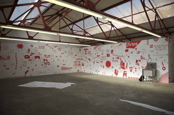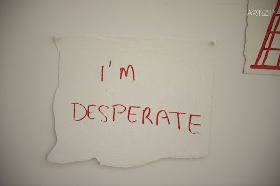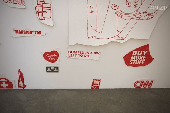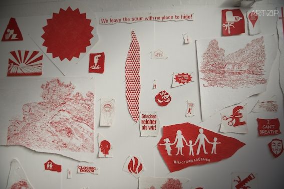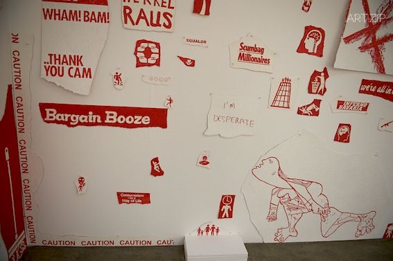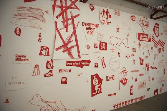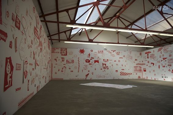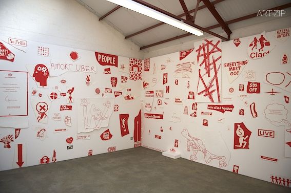 The hundreds of red and white drawings on torn paper that line the walls of the studio are an assortment of signs and symbols, steeped in references. Picking out the various slogans and familiar sayings gives the viewer a feeling similar to reminiscing or glancing through newspaper headlines.