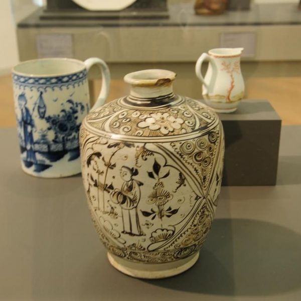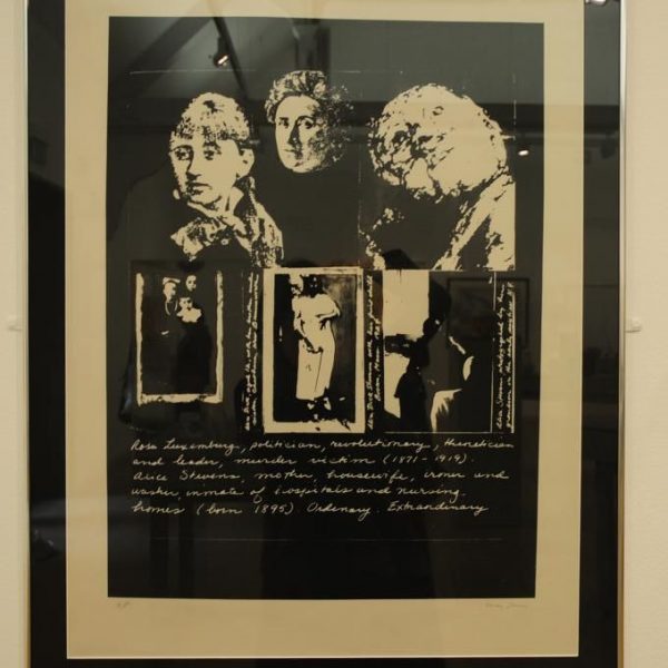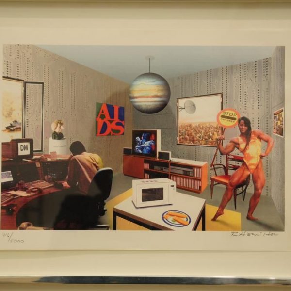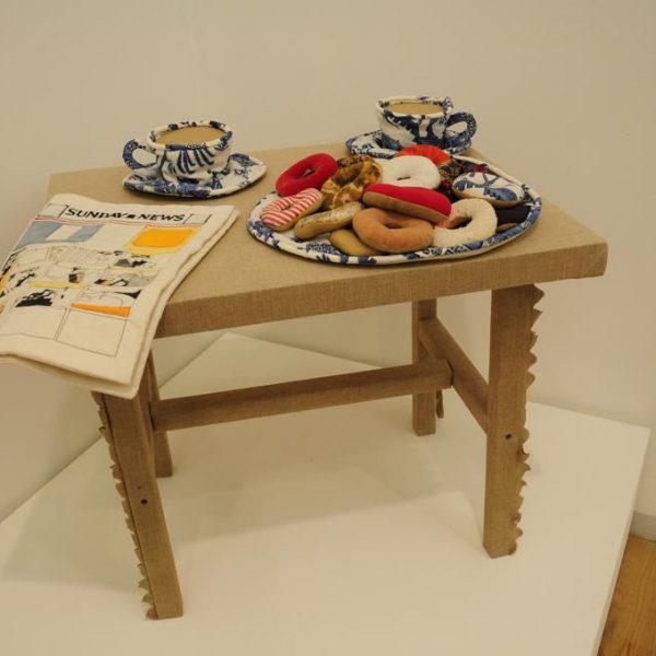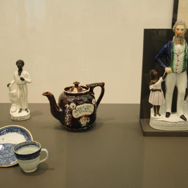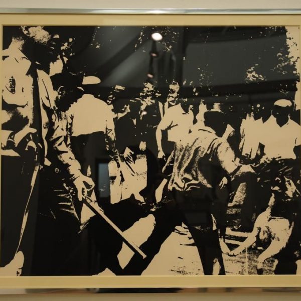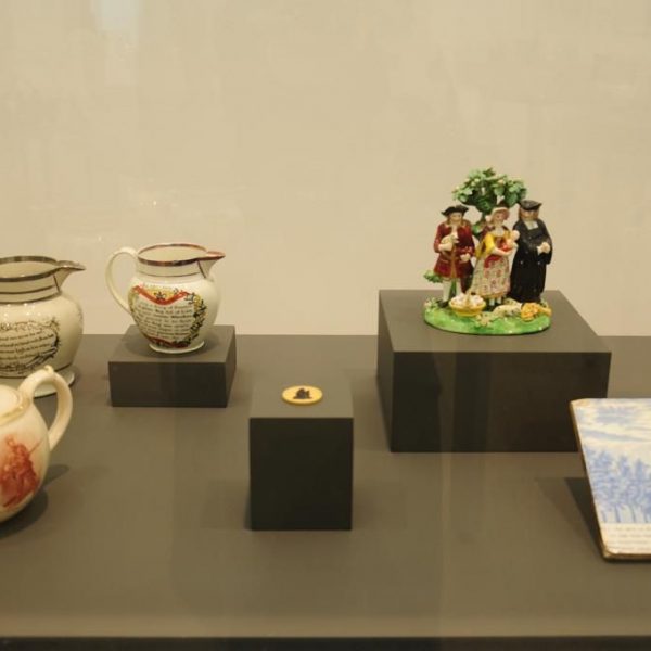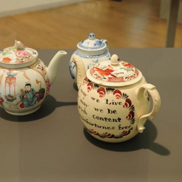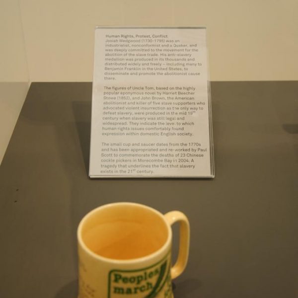 The exhibition also includes an Andy Warhol screenprint showing the Birmingham, Alabama, race riots in 1963; British Pop artist Richard Hamilton’s My Marilyn (1966) of Marilyn Monroe, plus a toby jug of Gordon Brown and a Margaret Thatcher teapot, and a Jann Haworth fabric tea table.