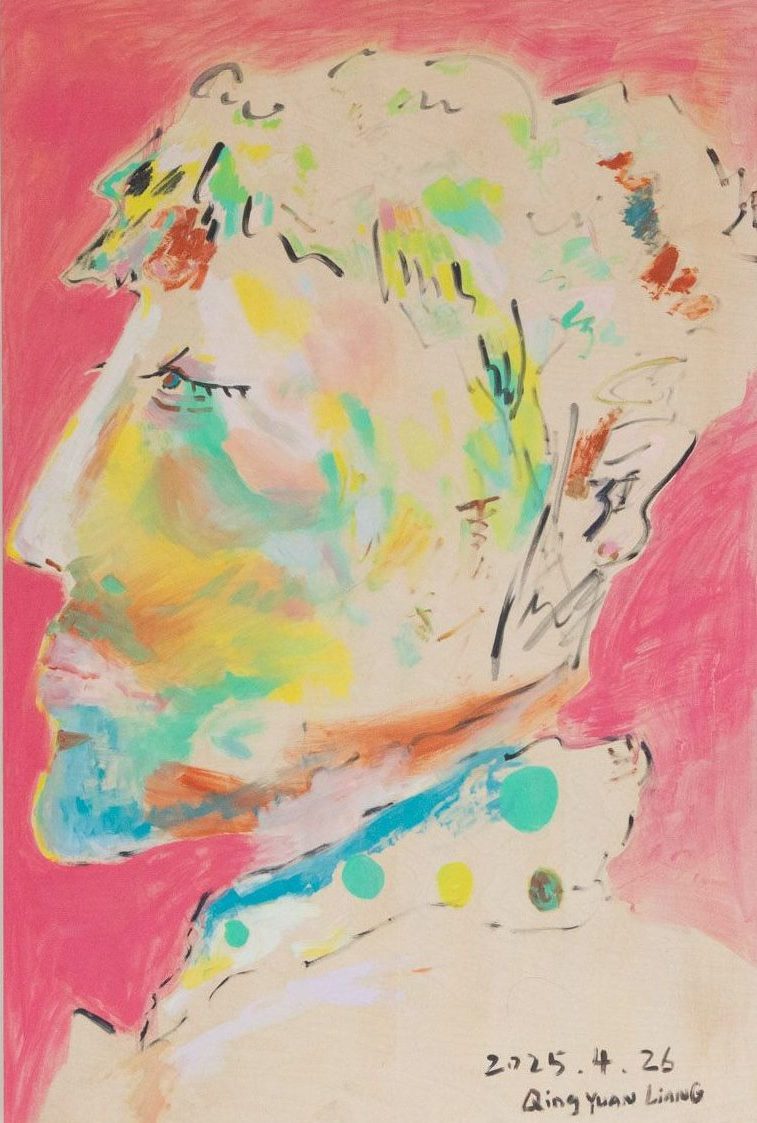 在梁清源手中,溫柔被精妙地塑造成一種抵抗的方式,柔軟則拓展為沉思的空間。油畫《The Pink Man》(2025)傳遞著這樣的思考:溫柔以其多元形態,並非脆弱,而是一種獨有的力量。這幅側面肖像描繪她一位穆斯林友人,背景是如泡泡糖般的粉紅色調,色彩的選擇是對性別與力量在美學感知層面一次刻意而含蓄的探問。肌理在堅實與朦朧間滑動,呼應著存在、凝視與文化具身的複雜意涵。在此作品中,人物被賦予個人與象徵的雙重品質:既是對二元框架的溫和打破,亦是邀請觀者看向更遠之處的目光。