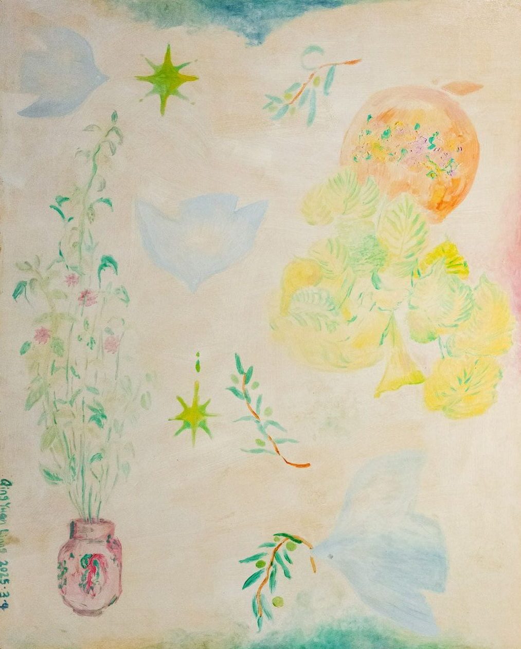 柔和的粉彩色調以輕旋薄染的筆觸,賦予梁清源的場景近乎童稚的天真氣韻,然而她所構築的寓言式超驗世界卻超越了稚嫩,意在呈現諸如哀傷與韌性這般永恆的情感地貌。其插畫小說《Bloom》(2022-23)正是如此,全書共六章,跟隨主人公淼在摯愛父親離世後開始思索生命與死亡的意義。敘事透過淼與家人、朋友、長者及孩童之間一系列溫柔內省的對話展開,其間綴滿日常生活的碎片。關於父親的回憶隨四季更迭,在花開花落的輪迴中,以靜謐的節奏流轉於片段之間。終章場景中,釋懷與和解亦悄然降臨,凝作春日一朵綻放的花。