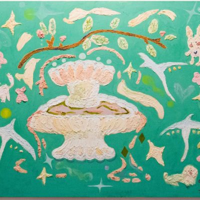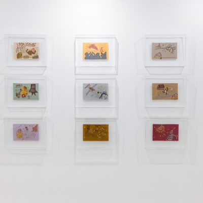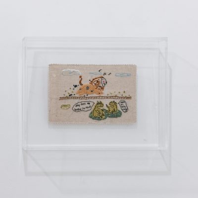 Whether through long-form narratives like the charming textile sequence A Lion Wants a Hug (2021), or singular, meditative compositions shaped by mood and place such as Wishing Well (2025) Liang’s work demonstrates an attentiveness to myth, landscape, and the fragile rhythms of life. Her practice is incredibly intuitive, unfolding slowly and with care. Where she glides between mediums–embroidery, painting, illustration, mosaic–and materials with ease, she never loses sight of the sense of comfort and quiet hope that anchor her imagination.