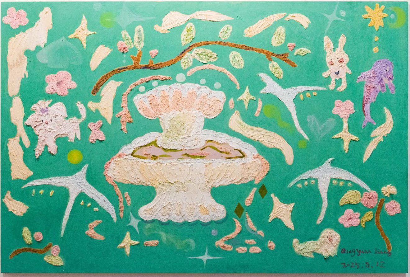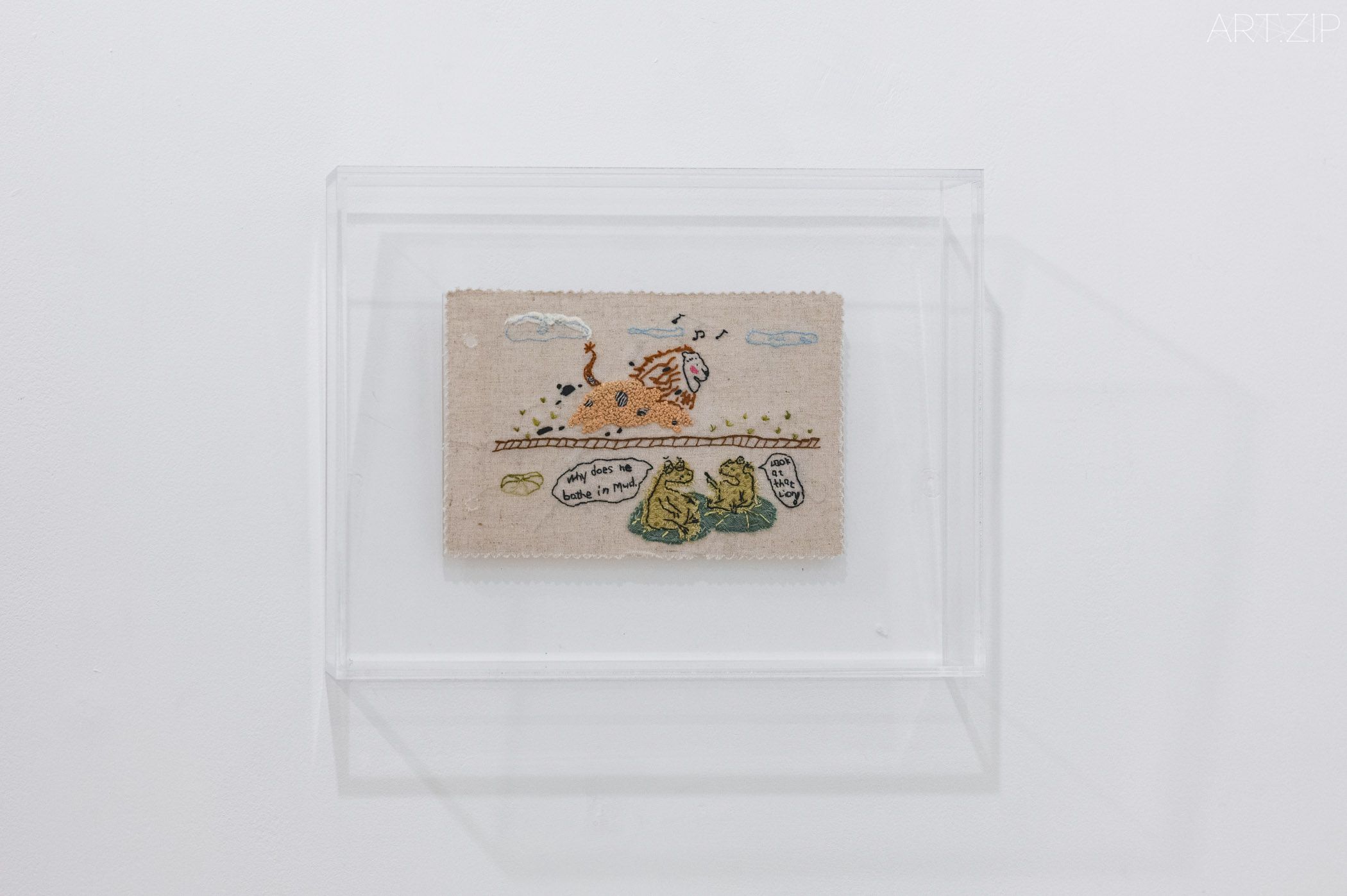 無論是如《A Lion Wants a Hug》(2021)這般以紡織序列展開的長篇敘事,抑或是《Wishing Well》(2025)這類由心境與場所塑造的獨幅冥想式作品,梁清源始終保持著對神話、風景與生命脆弱韻律的敏銳關注。她的創作實踐充滿驚人的直覺性,以細膩緩慢的節奏從容展開。她在刺繡、繪畫、插畫、馬賽克等多種媒介與材料間自如流轉,卻從未偏離那份錨定其想像內核的慰藉感與靜默希望。