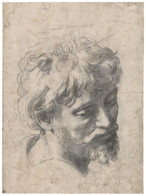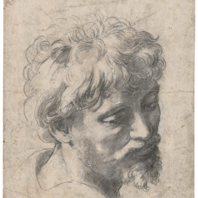 A room is then devoted to Raphael’s frescoes for Julius II’s private apartments, or Stanze. This four-room project included monumental, multi-figure compositions depicting biblical subjects, scenes from the history of the Church, allegories of concepts such as Poetry and the great gathering of philosophers known as the School of Allens (1509—10). Drawings on display include a life study for the Greek philosopher Diogenes (about 412-323 BCE) depicted in the School of Athens (Study for Diogenes, about 1508—10, silverpoint on paper primed in beige, rose and light‑purple, Stadel Museum, Frankfurt am Main.) In addition to his demanding commitment to the Stanze, Raphael found time for other commissions, including his penetrating portrait of the sickly and elderly, yet strong-willed Julius II, also exhibited in this room (1511, oil on poplar, the National Gallery, London) which transformed the way the powerful were depicted in Western art.