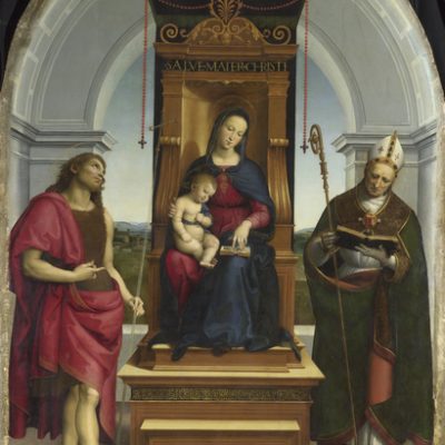 The exhibition then focuses on Florence where, as well as establishing himself within a new network of clients, Raphael continued to produce works for many other locations, including the Ansidei Madonna (The Virgin and Child with Saint John the Baptist and Saint Nicholas of Bari, 1505, oil on poplar, the National Gallery) for Perugia. A rare gathering of Raphael’s paintings of the Virgin and Child — the genre that he above all made his own — includes pictures dating to his time in Florence, as well as paintings executed during his first years in Rome, where he moved in 1508 to work for one of the great patrons in Western art history, Pope Julius II (reigned 1503-13).