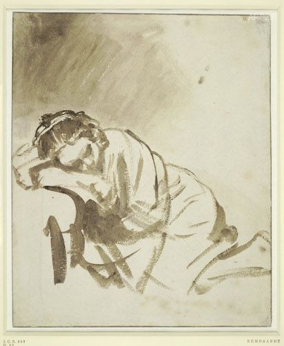 - X7943 Rembrandt A young Woman sleeping (Hendrickje Stoffels), about 1654 Brush and brown wash, with white bodycolour; ruled framing lines in pen and brown ink 24.6 x 20.3 cm The British Museum, London 1895,0915.1279 © The Trustees of The British Museum