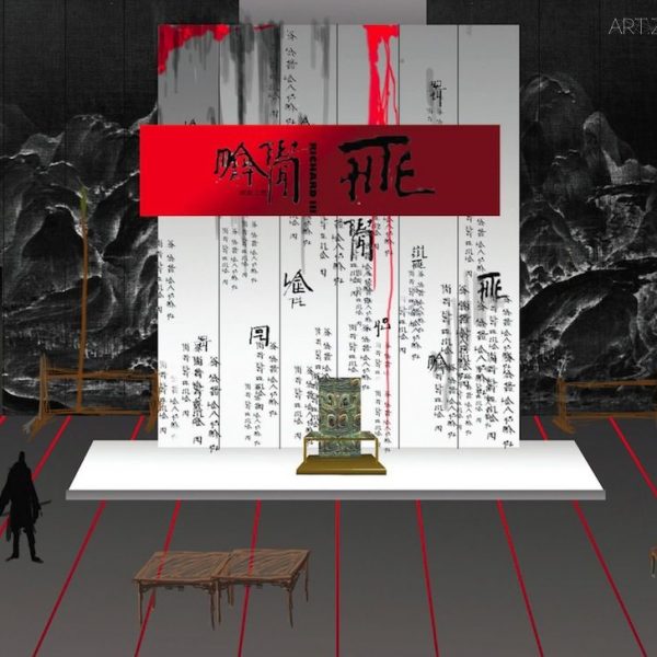 With a wood, high, open-air and enclosed stage, the physical conformation of the stage of the Shakespeare’s globe is very similar to that of ancient stages in china, so I graft the forms of chujiang (entering on the stage) and Ruxiang (exiting) on a Chinese opera stage onto Shakespeare’s play. the dwelling in the Fuchun Mountains, a painting by Huang gongwang who is a yuan dynasty painter, is placed in the rear of the stage, so that chujiang and Ruxiang are reasonably arranged. Xu Bing, the famous Chinese artist, specially writes some unique words for the play of Richard III, which, together with rice paper, constitutes a Shoujiu (curtains on an ancient Chinese opera stage), namely the stage background of traditional Chinese opera. We transfer the emotions conveyed by Chinese paper and china ink to Shakespeare’s era, and we expect that such