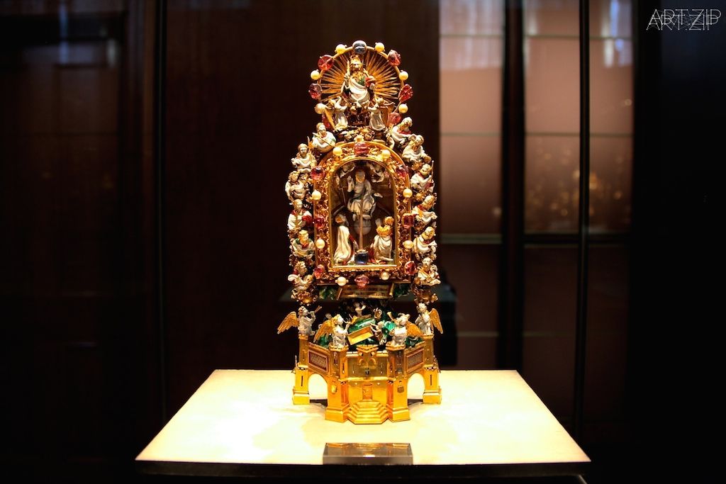 One of the star objects is the Holy Thorn Reliquary, made of gold, enamel and gems sculpted around a simple thorn, supposedly from the Crown of Thorns worn by Christ at his Crucifixion. It was featured in the BBC Radio 4 series A History of the World in 100 Objects, and was described by Neil MacGregor as “a single-object museum”. As one of the most important Christian relics, the Crown of Thorns was acquired by Louis IX, King of France, in Constantinople in 1239 for the price of 135,000 livres – nearly half the annual expenditure of France. The Reliquary was made in Paris around 1400 as a private devotional object for Jean, duc du Berry, one of the greatest collectors and art patrons of the late middle ages. In 1860 the reliquary went for repair to the restorer, Salomon Weininger, who copied it and sold the original which was acquired by Baron Anselm de Rothschild around 1873.