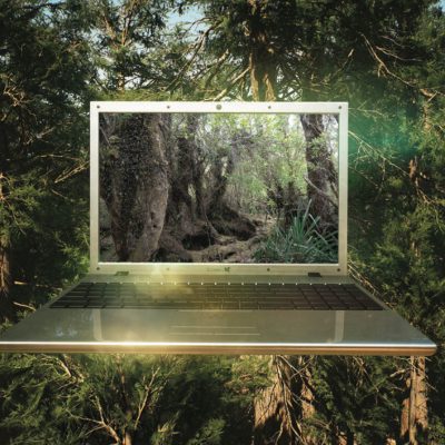 而在作品《步入森林》中,一台筆記本電腦漂浮在「人造」森林前,而一張真實森林的照片在遠處召喚。這個作品的結構由折疊和框架構成。儘管這些不同的界面似乎提供了一條路徑,但隨之而來的是一種陌生感,因為我們在類別名稱的轉換中迷失了方向,陷入困境。
