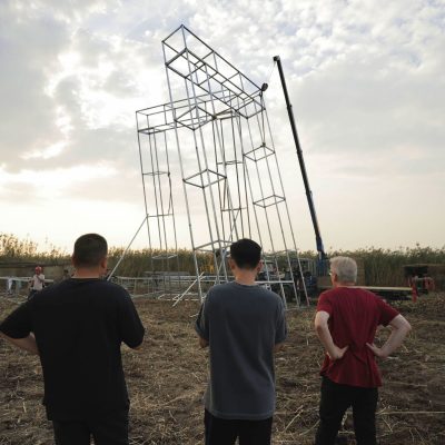 在這個展覽之前還有一件重要的大型作品位於遙遠的風景之中,是君山島「田野藝術」展覽的一部分。這件作品名為《積木遊樂場(2023)》,高達十米,由當地盛產的竹子和蘆葦建造而成。儘管這座結構龐大,但它仍然顯得脆弱,反映了生態的不確定性。與這種不穩定性形成對比的是,這件作品通過以一種輕鬆、趣味的方式來處理構成現實的基本元素。